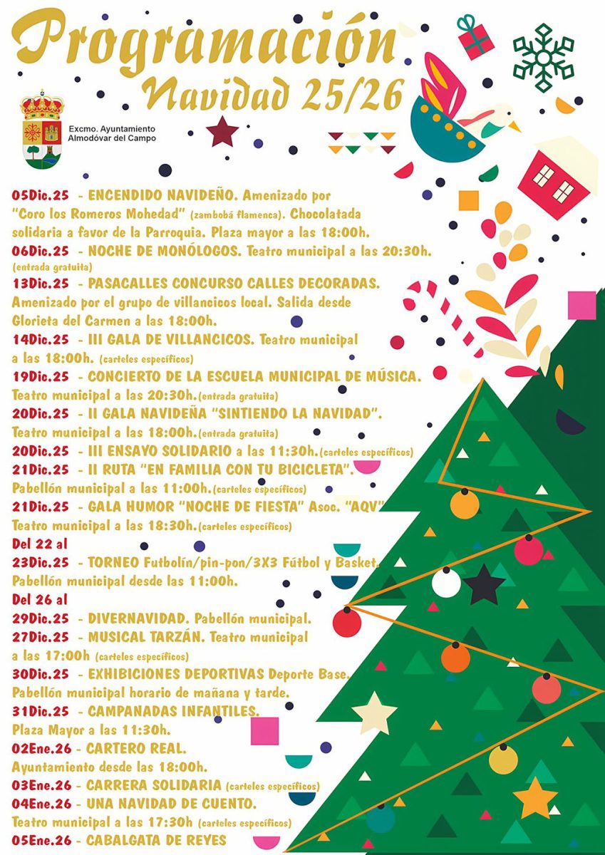 El 19 de diciembre tendrá lugar el concierto de la Escuela Municipal de Música y el 20 el III Ensayo Solidario de la Hermandad del Rescatado y la II Gala Navideña ‘Sintiendo la Navidad’. El 21 de diciembre se celebrará la II Ruta ‘En familia con tu bicicleta’ coordinada por el Club BTT ‘Valle de Alcudia’ y la Gala de Humor ‘Noche de Fiesta’.