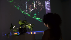 Una de las instalaciones está compuesta por una planta conectada a unos electrodos que miden las microfluctuaciones en su campo eléctrico. Estos datos son analizados y convertidos a estimulos sonoros y visuales. Además de crear su propia banda sonora, la planta modifica el espacio virtual de un entorno real digitalizado previamente.