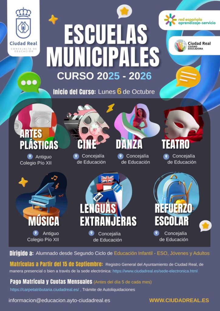La concejalía de Educación del Ayuntamiento de Ciudad Real ha abierto el plazo de matrículas para las siete Escuelas Municipales del curso 2025/2026. La oferta incluye Artes Plásticas y Pintura, Cine y Audiovisuales, Danza, Teatro, Música, Lenguas Extranjeras y Refuerzo Escolar, con un total de 390 plazas disponibles.