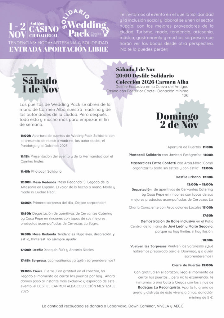 El evento ha contado con la colaboración entre áreas municipales, especialmente con la Concejalía de Servicios Sociales, que ha contribuido a hacer realidad la vertiente inclusiva. El programa contempla una amplia agenda de actividades que arrancarán el sábado 1 de noviembre con la apertura institucional y una mesa redonda sobre el legado de la artesanía en España, además de degustaciones, desfiles de moda solidarios y actuaciones musicales. La jornada culminará con el Desfile Solidario de la Colección 2026 de Carmen Alba, madrina del evento.