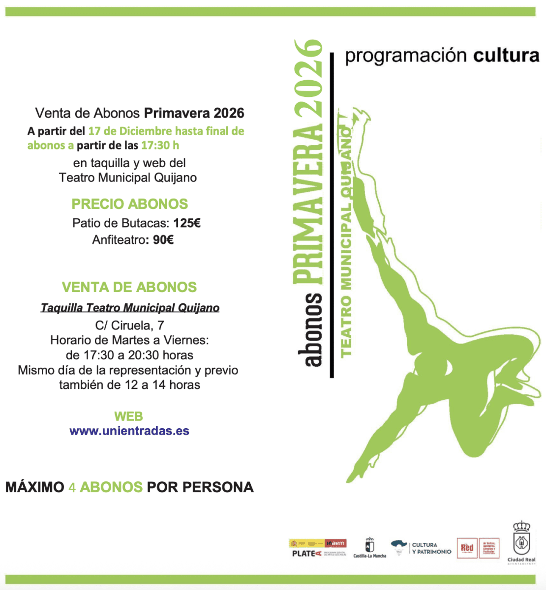 La concejalía de Cultura del Ayuntamiento de Ciudad Real pondrá a la venta el 17 de diciembre un total de 300 abonos para la temporada de primavera de teatro en el Municipal Quijano. La temporada comenzará el 10 de enero con la obra «Inmaduros» y finalizará el 21 de mayo con «Gool», con un total de 10 representaciones que tendrán un coste de 125 euros en el patio de butacas y de 90 euros en anfiteatro.