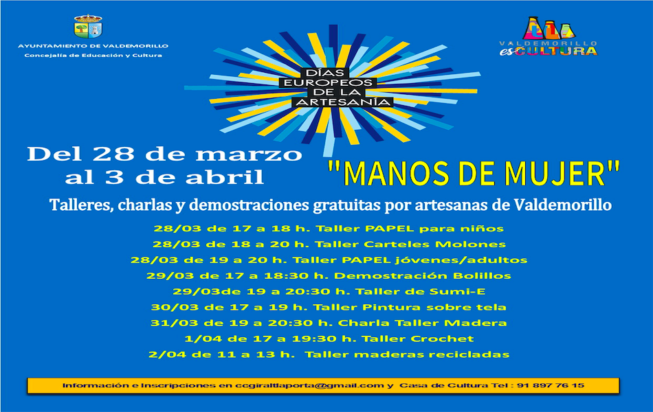 Este año los ‘Días Europeos de la Artesanía’ estarán enteramente en manos de mujer en Valdemorillo. Porque el Ayuntamiento, a través de la concejalía de Educación y Cultura, ha sido receptivo al planteamiento brindado por las propias artesanas, “que en esta localidad precisamente son muchas”. Ya que han sido ellas las que se han brindado personalmente a ofrecer todo un carrusel de demostraciones en vivo y talleres de modo que, al tiempo que dan a descubrir sus técnicas y conocimientos a la hora de trabajar con unos y otros materiales, abarcando una gama de los más diversa, quieren tener la oportunidad de sumar un motivo más para acercar su labor al resto de la población, “haciendo partícipes a todos de la importancia y verdadera dimensión que cobra este hacer artesano, que siempre debemos saber promocionar e impulsar. Es una idea que nos ha parecido realmente muy acertada y que estamos encantados de poner en marcha, prestando nuestro apoyo y colaboración a todas las participantes”.