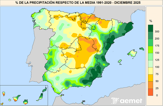 Diciembre de 2025 se sitúa como el decimonoveno más cálido desde 1961 y el undécimo del siglo XXI, así como el vigesimoquinto más húmedo de la serie histórica y el octavo de este siglo.
