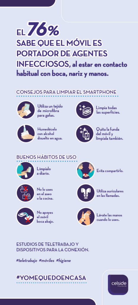 Dado su uso constante, resulta clave una correcta limpieza: un 76% de los españoles es consciente que el móvil es portador de agentes infecciosos e intenta limpiarlo, según el estudio elaborado recientemente por Celside Insurance e Ipsos.