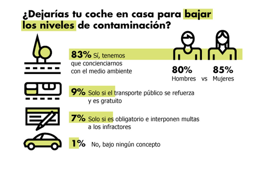 Según este estudio, los hombres son más partidarios de adoptar restricciones (80% frente al 77% de mujeres) y además un 85% dejaría su coche en casa sin reparos cuando se apliquen los protocolos (frente al 80% de las mujeres).