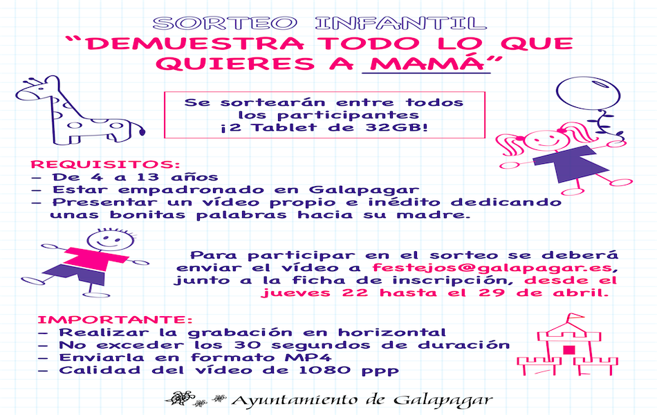 El Ayuntamiento de Galapagar vuelve a convocar un sorteo infantil pero, esta vez, con motivo del Día de la Madre que se celebrará el próximo domingo 2 de mayo, de esta forma, los niños y niñas de nuestro municipio podrán ganar una de las dos Tablet de 32 GB que se sortearán.