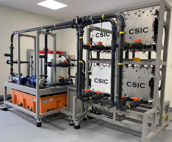 Un equipo de investigadores del CSIC ha desarrollado un prototipo de batería de flujo redox de vanadio de 10 kilovatios (Kw) para demostrar su viabilidad como sistema de almacenamiento de energía eléctrica a gran escala, dirigido especialmente a las energías renovables. Este prototipo de 10 kW (10 kW de potencia y 20 kWh de energía) permite acumular energía eléctrica para aplicaciones estacionarias, como el almacenamiento de energía en viviendas o pequeños comercios