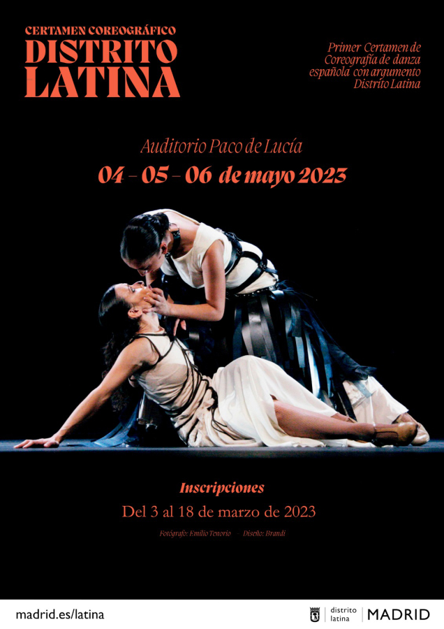 La Junta Municipal de Latina convoca el primer Certamen de Coreografía de Danza Española con Argumento, abierto a creadores e intérpretes profesionales residentes en España o en el extranjero con obras inéditas o estrenadas recientemente. El certamen coreográfico del distrito de Latina, que se celebrará en el Auditorio Paco de Lucía del 4 al 6 de mayo, nace con el objetivo de dar visibilidad a la creación de piezas de danza española con argumento y temática y convertirse en una nueva plataforma de exhibición y promoción para coreógrafos y bailarines, además del espacio donde puedan compartir su experiencia con el público.