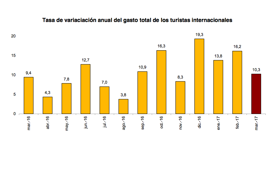 Durante los tres primeros meses de 2017 el gasto total de los turistas internacionales aumenta un 13,2% respecto al mismo periodo del año anterior, alcanzando los 13.655 millones de euros.