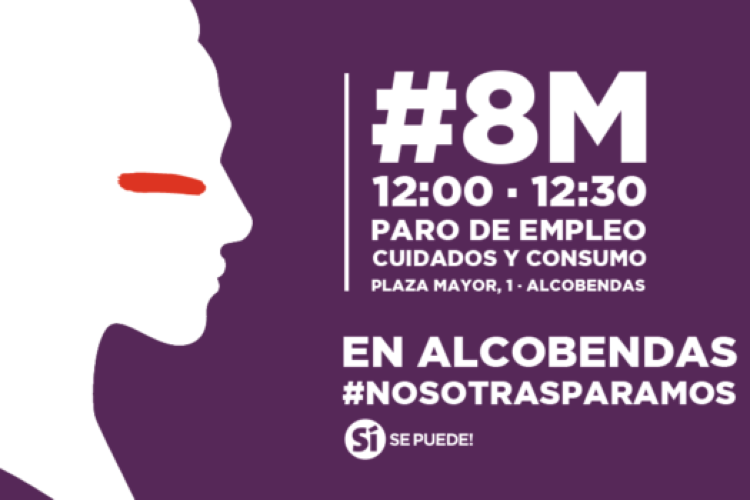 Desde la puerta del Ayuntamiento de Alcobendas, Sí Se Puede se sumará al paro de empleo, cuidados y consumo que acontecerá el próximo miércoles de 12:00 a 12:30 horas para acompañar, respaldar y visibilizar a todas aquellas mujeres que durante media hora dejarán de estudiar, trabajar, cuidar, limpiar, consumir y de realizar, en definitiva, todas aquellas tareas, remuneradas o sin remunerar, que las convierten en personas indispensables en la sociedad.