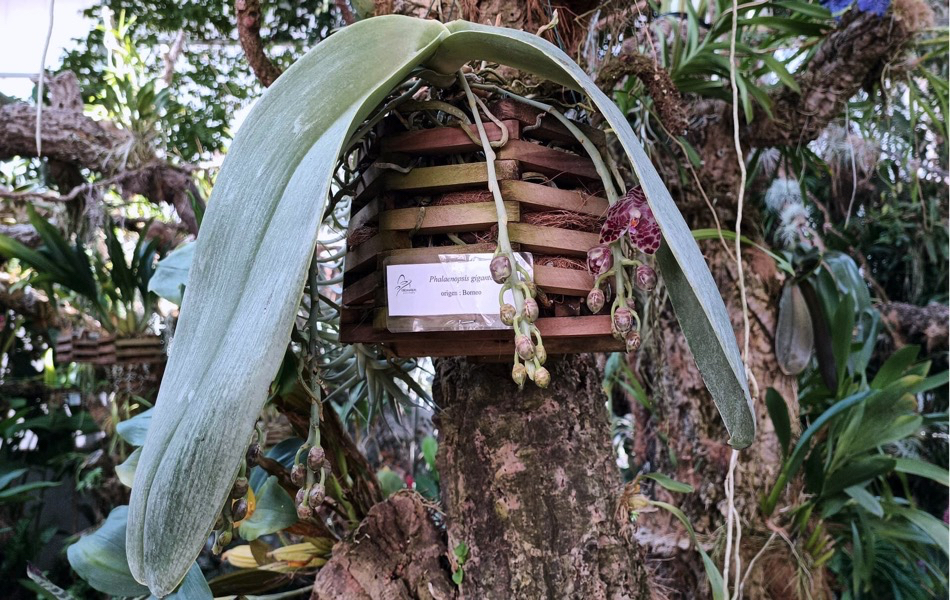 Por estas características, son conocidas en Borneo, como ‘orejas de elefante’, en alusión no solo al tamaño sino también a su forma. Sus flores son grandes, vistosas, de aspecto céreo, con bellas franjas de rojo granate sobre un fondo de color amarillo pálido, y un agradable perfume. Además, esta planta tiene la particularidad de que crece hacia abajo, por lo que los visitantes observarán las raíces y hojas en la parte superior mientras que las flores cuelgan desde el interior