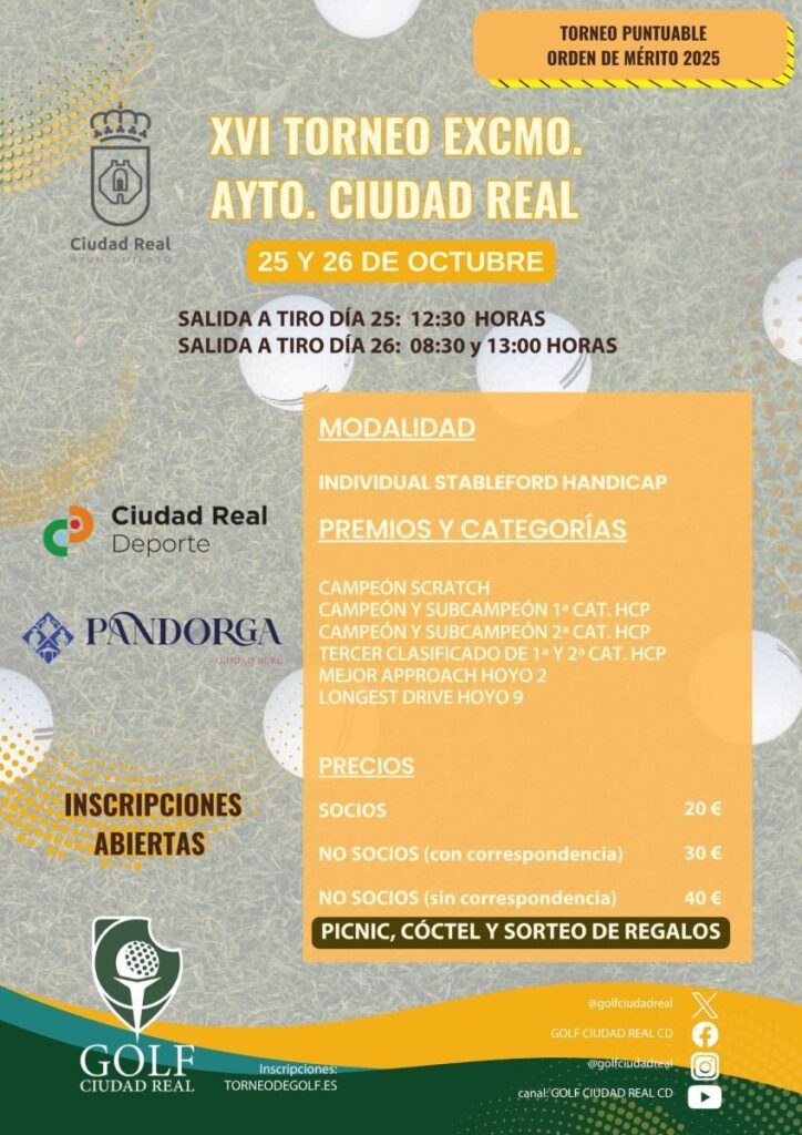 El Club de Golf Ciudad Real acoge este fin de semana la XVI edición del Torneo Excelentísimo Ayuntamiento de Ciudad Real. La competición se desarrollará con tres salidas al campo: el sábado 25 de octubre a las 12:30 horas y el domingo 26 a las 08:00 y a las 13:00 horas. Alrededor de 90 jugadores han formalizado su inscripción en el evento que cierra la orden de mérito anual del Club Golf Ciudad Real.