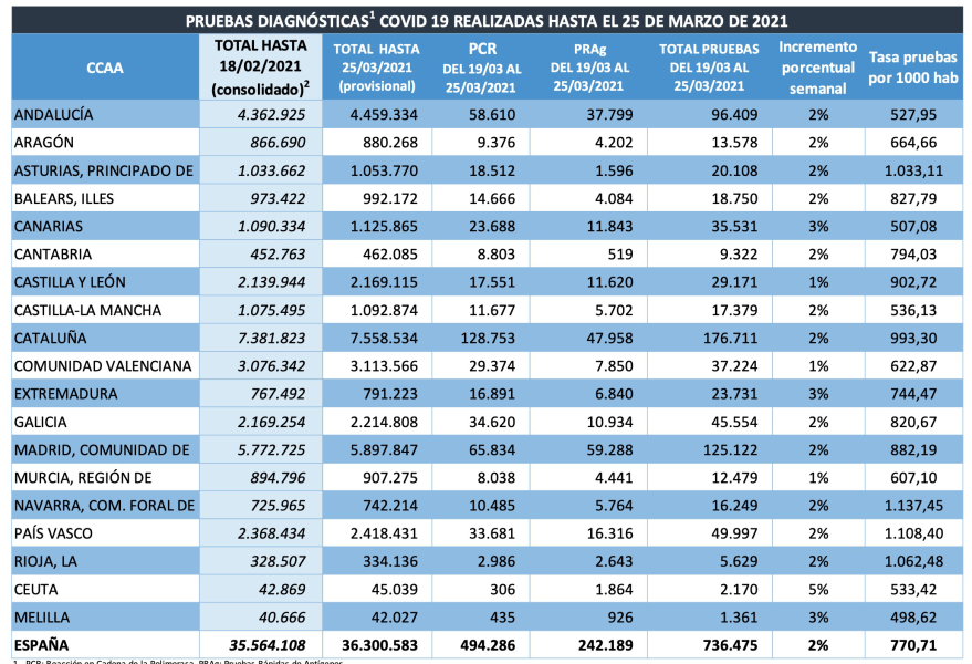 España ha realizado más de 36,3 millones de pruebas diagnósticas desde que comenzó la epidemia por COVID-19. Concretamente, las comunidades autónomas han notificado al Ministerio de Sanidad que, hasta el 25 de marzo, han llevado a cabo un total de 36.300.583 pruebas diagnósticas. De éstas, 27.573.864 son PCR y 8.726.719 son test de antígenos.