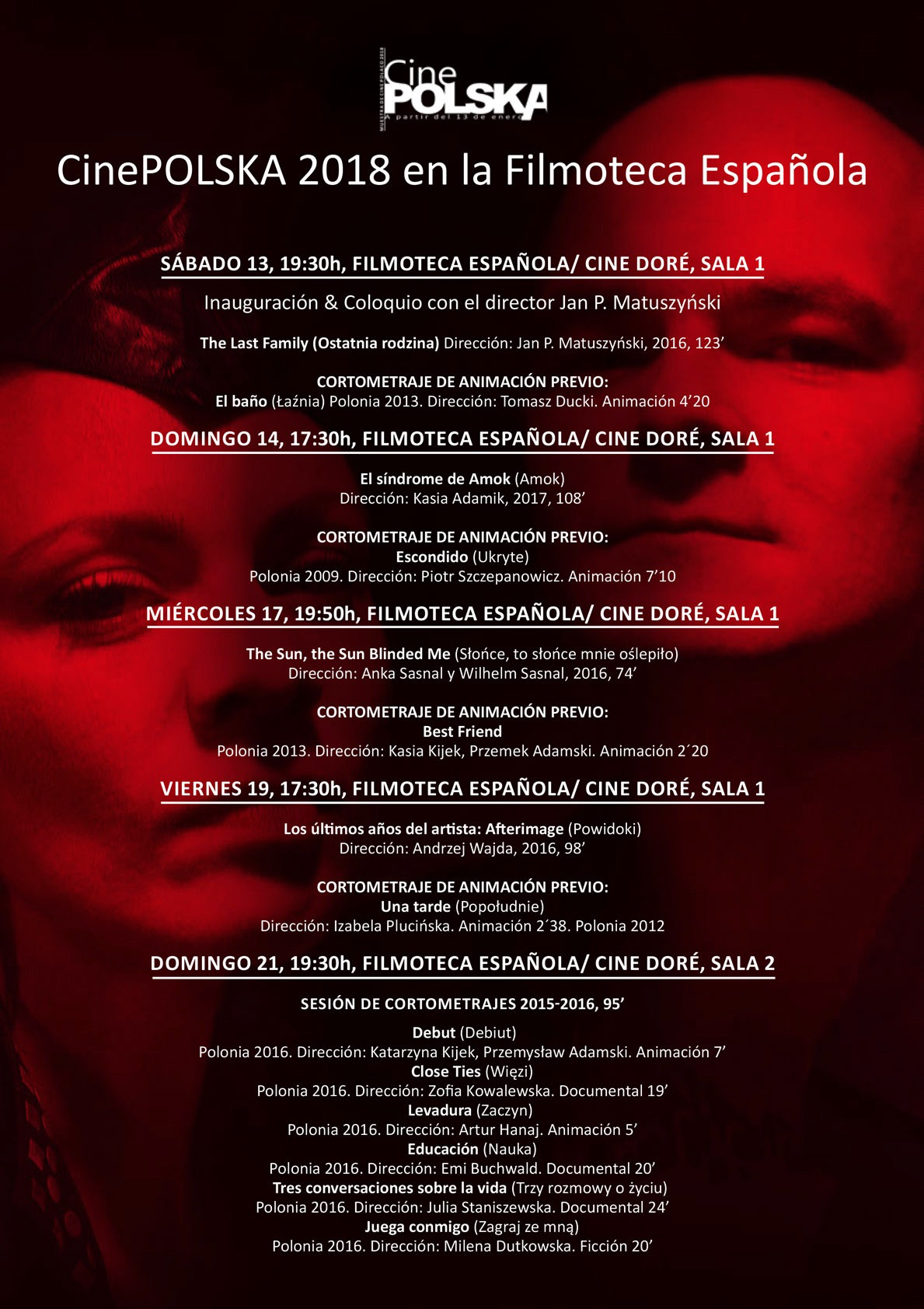 El ciclo será inaugurado el día 13 de enero a las 19:30 por Jan P. Matuszynski, el joven director de The Last Family, que presentará la película y mantendrá un coloquio con el público. A esta sesión inaugural asistirán también la embajadora de Polonia y la directora del Instituto Polaco de Cultura.