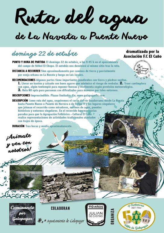 El domingo 22 de octubre la Asociación V Centenario de Galapagar ha organizado una Ruta del Agua, desde La Navata a Puente Nuevo. Todas las personas que se hayan apuntado a través de la web de la Asociación, deberán estar a las 9:45 horas en el parking del campo de fútbol “El Chopo”, que será de donde salga del autobús.