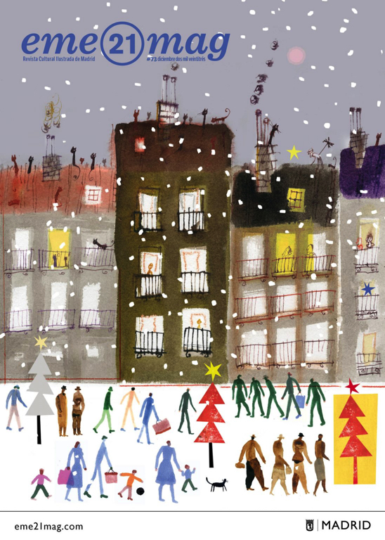 La portada del mes de diciembre de eme21mag, la revista ilustrada del Área de Cultura, Turismo y Deporte, es obra del ilustrador Javier Zabala, Premio Nacional de Ilustración 2005. Estrellas, árboles de Navidad y luces brillan en las nevadas calles de Madrid junto a un carrusel de gentes que componen esta viva estampa navideña.