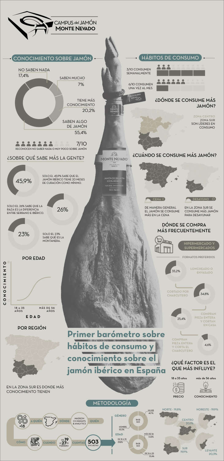 Campus del Jamón de Monte Nevado es el primer centro en el mundo dedicado íntegramente a la investigación, la formación y la difusión de la cultura del jamón curado, ha lanzado el primer Barómetro sobre consumo y conocimiento del Jamón Ibérico en España, con el objetivo de dar a conocer los hábitos de consumo y la familiarización de los españoles con una de las grandes joyas de la gastronomía de nuestro país: el jamón ibérico.
