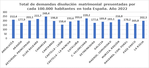 A nivel nacional y poniendo en relación las demandas de disolución matrimonial del total del año con la población a 1 de enero de 2022, se observa que el mayor número de demandas de disolución por cada 100.000 habitantes se dio en Canarias, con 248,4; Comunidad Valenciana, con 228,2; Islas Baleares, con 222,7; Murcia, con 216,8; Andalucía, con 212,4; Cataluña, con 203,6, y Asturias, con 203,1, territorios que superan la media nacional, que fue de 200,9 demandas por cada 100.000 habitantes.