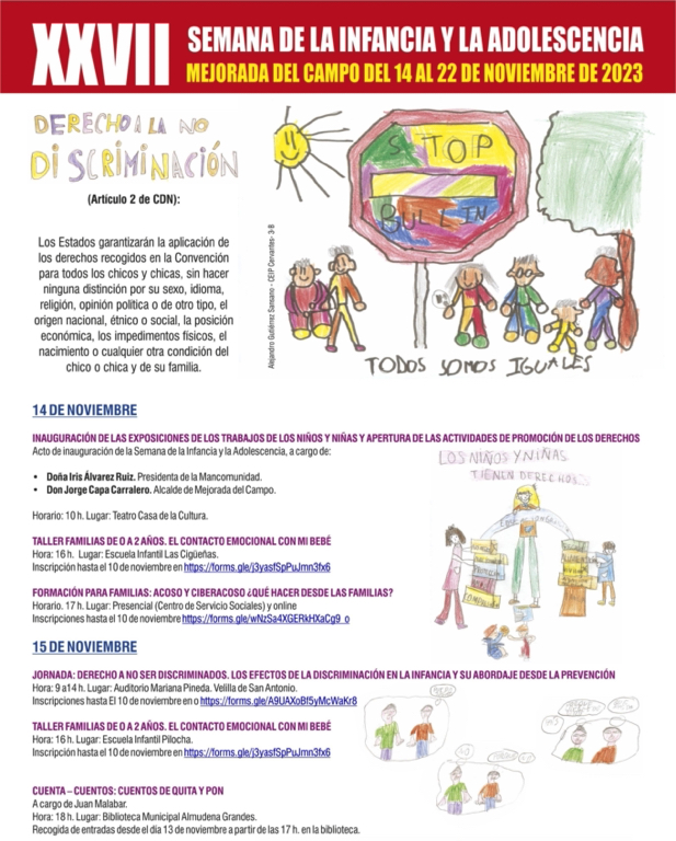 La programación comenzará el martes 14 a las 10 horas con la inauguración de las exposiciones de los trabajos de alumnos y alumnas de Primaria, así como la apertura de las actividades de promoción de los derechos donde estarán presentes el alcalde de Mejorada, Jorge Capa, y la presidenta de la Mancomunidad, Iris Álvarez. Será el pistoletazo de salida para continuar con talleres para familias, formaciones, jornadas, cuentacuentos o teatro.