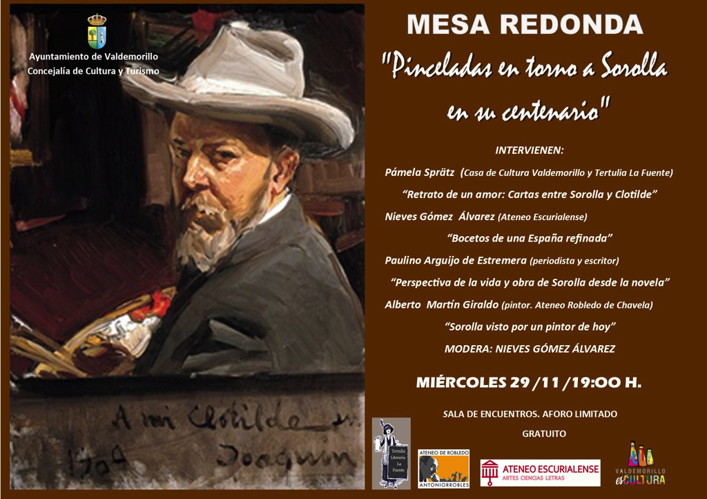 Valdemorillo también trae a su programación cultural un acto en torno a la figura de Joaquín Sorolla y Bastida, uno de los grandes maestros de la pintura española de finales del siglo XIX e inicios del XX, al cumplirse en este 2023 el centenario de su muerte. En concreto, y a propuesta de la Tertulia Literaria la Fuente, el 29 de noviembre se celebrará una mesa redonda que servirá, además, para inaugurar en la práctica la hermandad en favor de la difusión cultural que representa la colaboración que ahora mantienen el colectivo que preside Pilar Rodríguez Laserna, el Ateneo Escurialense y el también Ateneo Antonio Robles de Robledo de Chavela. Mostrando así la importancia del trabajo en equipo para impulsar iniciativas como ésta, en el caso de la convocatoria de este miércoles se abordarán diversos aspectos del genial pintor, el de mayor proyección internacional de su tiempo y una de las figuras capitales de la historia del arte español en su conjunto, conocido como el maestro de la luz.