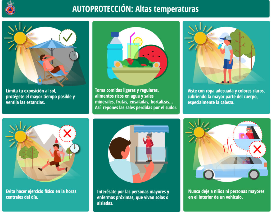 Las recomendaciones de la Dirección General de Protección Civil y Emergencias al respecto de altas temperaturas a seguir por la ciudadanía son: