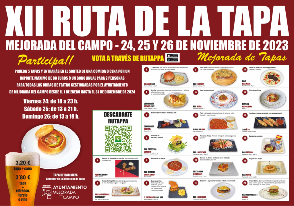El Ayuntamiento de Mejorada del Campo, a través de la Concejalía de Desarrollo Local, pone en marcha la XII Ruta de la Tapa. Veinte bares y restaurantes del municipio ofrecerán sus propuestas gastronómicas durante el último fin de semana de noviembre, del 24 al 26 de noviembre.