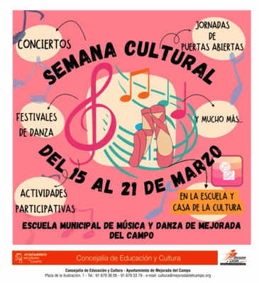 El Ayuntamiento de Mejorada del Campo, a través de la Concejalía de Cultura y la Escuela municipal de Música y Danza, organiza una Semana Cultural para que tanto el alumnado como las familias y el público general puedan disfrutar de distintas iniciativas relacionadas con la música y la danza.