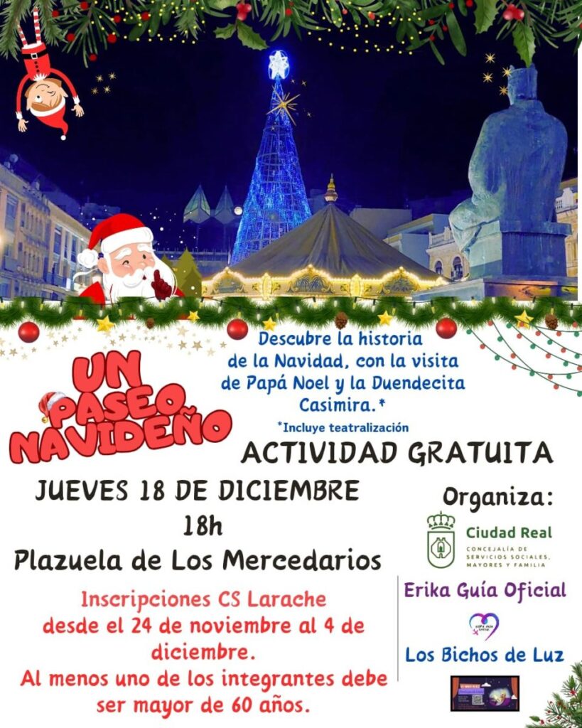 Ciudad Real se prepara para vivir la magia de la Navidad con una propuesta cultural y lúdica dirigida especialmente al público mayor. El próximo jueves 18 de diciembre a las 18:00 horas, la Plazuela de Los Mercedarios acogerá «Un Paseo Navideño», una actividad que promete sumergir a los participantes en la historia y tradiciones de estas fiestas.